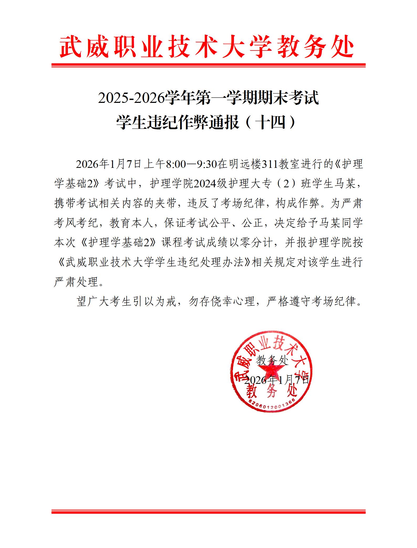 2025-2026學(xué)年第一學(xué)期期末考試學(xué)生違紀(jì)作弊通報(bào)(十四)